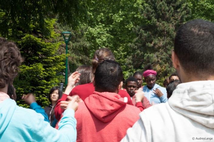 Collégiens, apprenants et artistes continuent à composer ensemble accompagnés de l’équipe organisatrice et des bénévoles. Chacun crée autour de ses souvenirs, à travers les mouvements de corps et grâce à sa voix.